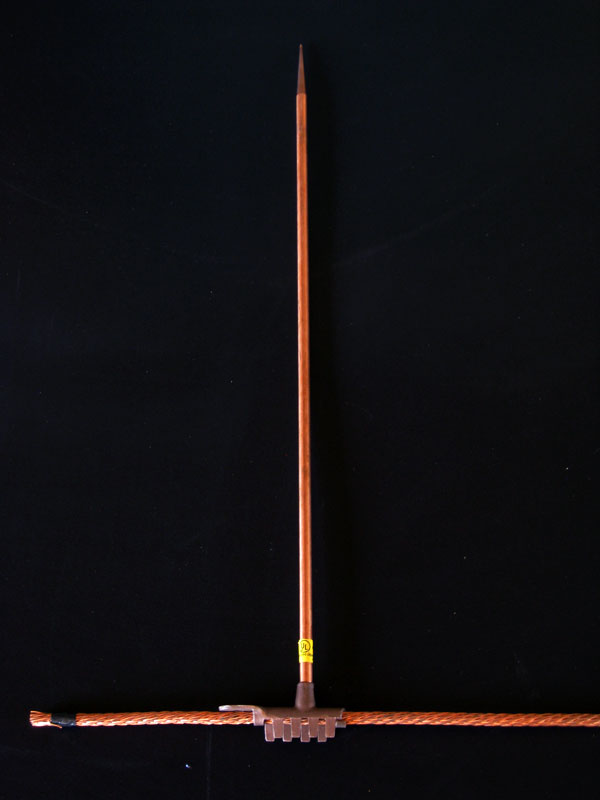 9 foot ground rods are driven 10 feet deep near the corner of the building where Lightning protection cables are connected below grade with bronze clamps and stainless steel bolts.