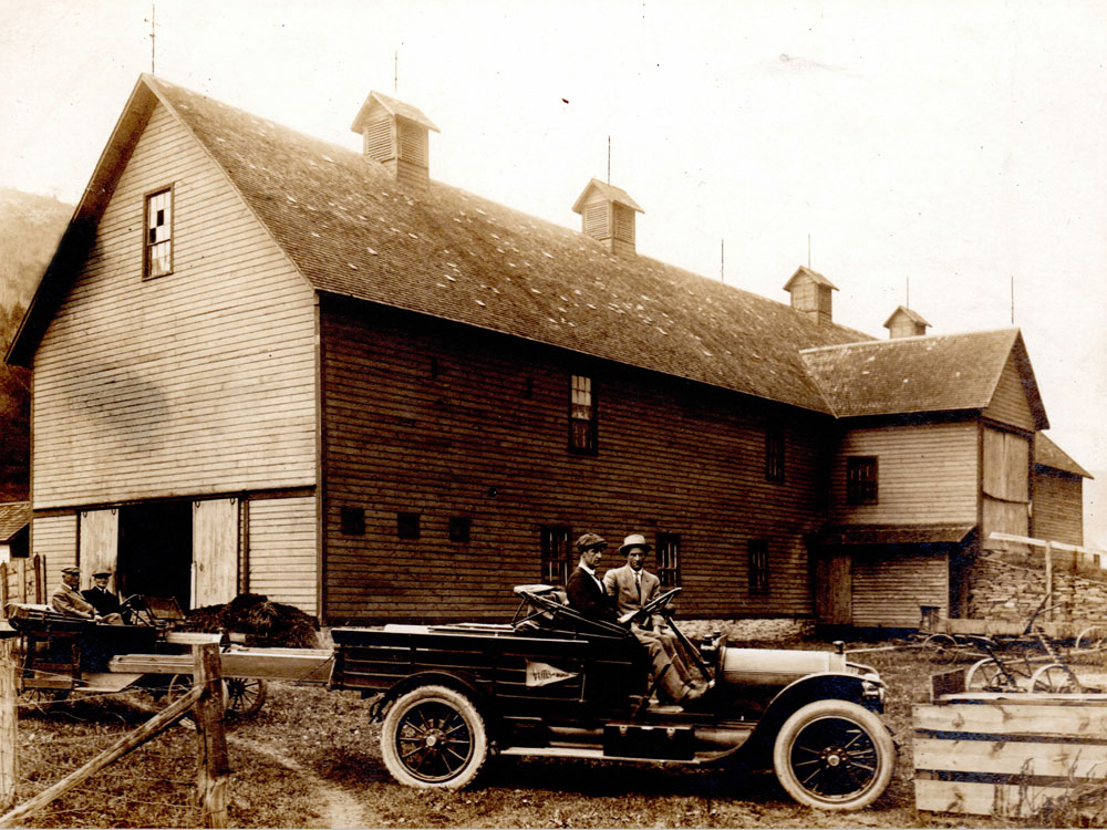 Woods Lightning Protection installed Lightning rods on this barn in Deposit, New York in 1914. Philip Woods is driving the first company truck in the foreground. Founder Frank A. Woods is in the car to the left.